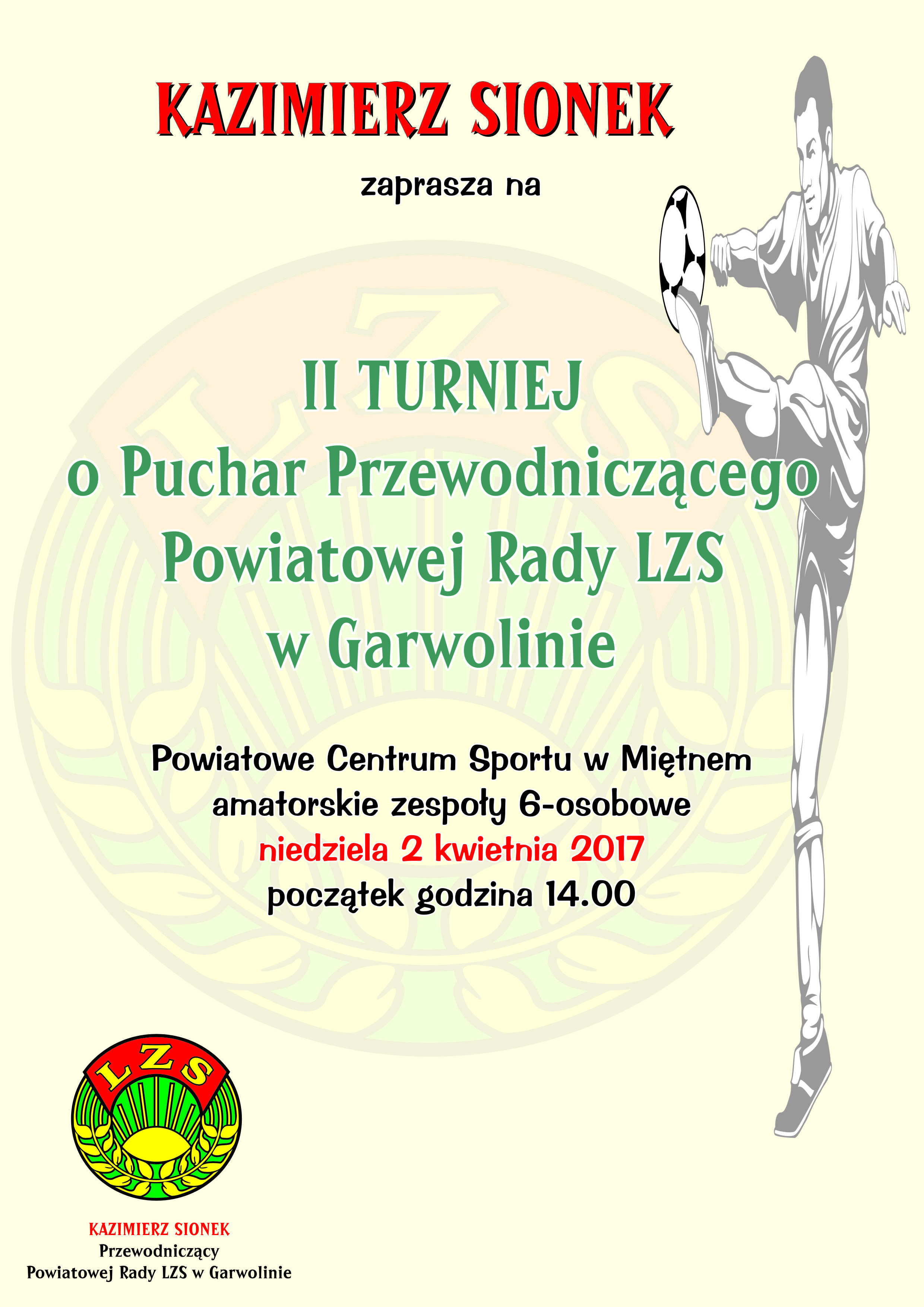 W niedzielę 2 kwietnia 2017 roku odbędzie się druga edycja turnieju piłkarskiego o Puchar Przewodniczącego Powiatowej Rady LZS w Garwolinie – Kazimierza Sionka. Ze względu na dość długą nazwę skrótowo turniej określany jest jako Puchar Kazimierza.