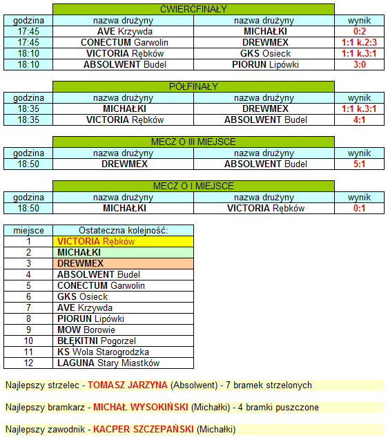 Pierwsze miejsce zajął zespół Victorii Rębków, który w finale pokonał 1:0, zespół Michałków (gmina Wilga). Na kilkanaście sekund przed zakończeniem spotkania decydującą bramkę zdobył Dariusz Rogowski. Na trzecim miejscu Drewmex, który w finale pokonał zdecydowanie Absolwenta Budel 5:1. Ciekawostką jest, że obie drużyny spotkały się w meczu grupowym. Wtedy zdecydowanie lepszy był Absolwent, który wygrał 4:1.