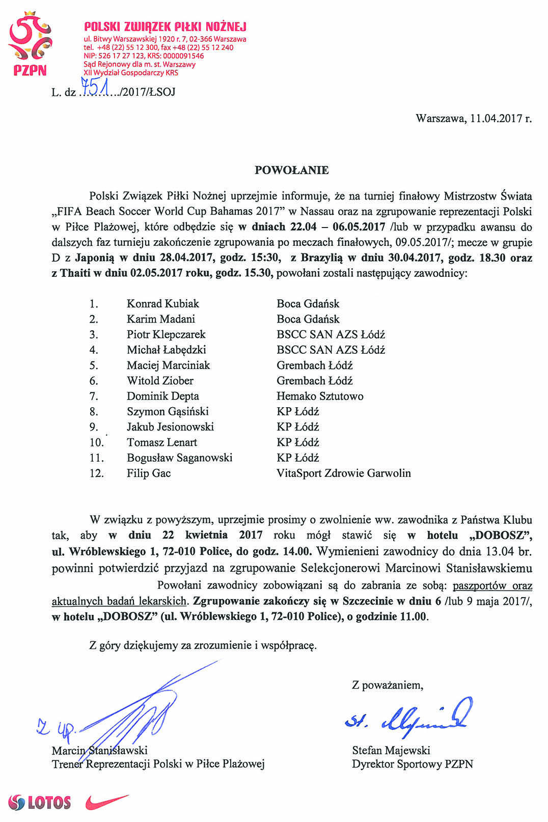 Przed Mistrzostwami Świata na Bahamach (kwiecień – maj 2017) reprezentacja Polski rozegrała dwa mecze towarzyskie z Portugalią – aktualnym Mistrzem Świata. W obu zagrał nasz człowiek. 5 kwietnia 2017 w portugalskim Faro, Polacy przegrali minimalnie 4:5. Bramki dla Polaków zdobywali Klepczarek, Jesionowski, Gac i Saganowski.