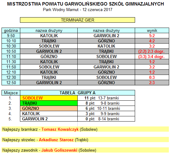 12 czerwca 2017 roku odbyły się w Parku Wodnym Mamut Mistrzostwa Powiatu Garwolińskiego Szkół Gimnazjalnych. W turnieju rozgrywanym systemem każdy z każdym wzięło udział 5 gimnazjów: Garwolin nr 2, Górzno, Sobolew, Trąbki oraz Katolik z Garwolina. Po emocjonujących meczach i wyrównanej rywalizacji najlepszymi okazali się gimnazjalisci z Sobolewa (opiekun Tomasz Wicha) i to oni zdobyli pierwszy, historyczny tytuł Mistrza Powiatu w plażowej piłce nożnej. Zawody zostały zorganizowane przez Szkolny Związek Sportowy oraz Powiatowe Zrzeszenie LZS w Garwolinie, a odbyły się na gościnnym obiekcie Park Wodny Mamut.