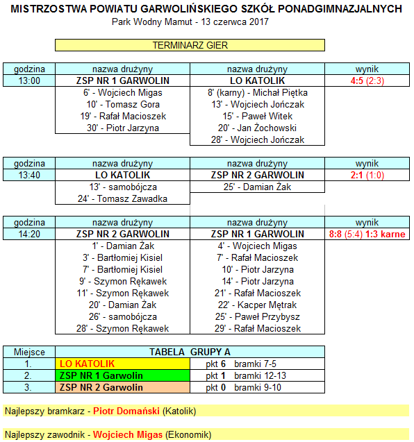 13 czerwca 2017 roku odbyły się w Parku Wodnym Mamut Mistrzostwa Powiatu Garwolińskiego Szkół Ponadgimnazjalnych. W turnieju wzięły udział 3 zespoły: ZSP nr 1 w Garwolinie im. Bohaterów Westerplatte , ZSP nr 2 w Garwolinie im. Tadeusza Kościuszki i Katolickie Liceum im. C. K. Norwida. Po emocjonujących meczach i wyrównanej rywalizacji najlepszymi okazali się zawodnicy z Katolika i to oni zdobyli pierwszy, historyczny tytuł Mistrza Powiatu w plażowej piłce nożnej. Opiekunem zwycięskiej ekipy był Łukasz Zawadzki. Zawody zostały zorganizowane przez Szkolny Związek Sportowy oraz Powiatowe Zrzeszenie LZS w Garwolinie, a odbyły się na gościnnym obiekcie Park Wodny Mamut.