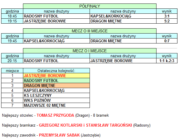 mecze grupowepółfinały, finałyRozpoczęcie meczu finałowegoDecudujący karny Puchary, statuetki, piłkiKapsel&Korkociąg - IV miejsceDragon Miętne - III miejsce Dragon Miętne inaczej Radosny Futbol - II miejsceJasrzębie Borowie - I miejsce Najlepsi z najlepszych. Od lewej: Marcin Kołodziejczyk, Przemysław Sabak, Tomasz Przygoda, Stanisław Targoński i Grzegorz Kotlarski