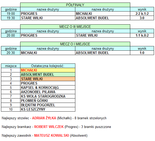 Mecze grupowe miały w zdecydowanej większości wyrównany przebieg. Początek sezonu halowego, to duża niewiadoma. Bardzo dobrze w meczach grupowych zaprezentowały się ekipy Progresu i Starych Wilków oraz rewelacja tego turnieju – zespół Michałków, które potwierdzają, że są drużyną turniejową. Zabrakło w półfinale ekip, które zaliczane były do potencjalnych faworytów, czyli Płomień Górki i Akzonobel Pilawa oraz dobrze ostatnio spisujący się Kapsel i Korkociąg. Zwycięstwo w całym turnieju Michałków, to duża niespodzianka, co potwierdzają notowania u miejscowych bukchmacherów.