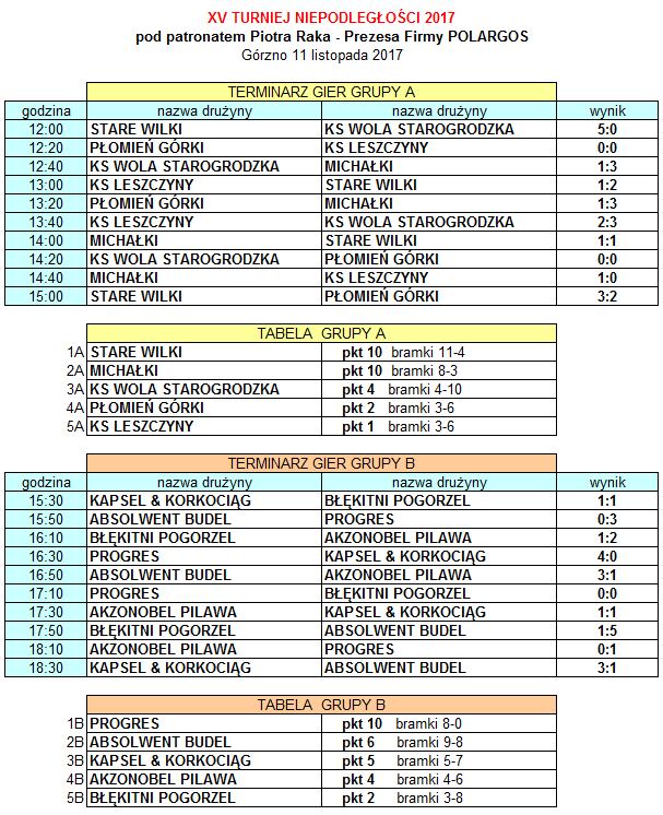 XV Turniej Niepodległości pod patronatem Piotra Raka – Prezesa Firmy POLARGOS wygrywają Michałki, które w finale pokonują ubiegłorocznego zwycięzcę – zespół Absolwenta Budel. Bohaterem finałowego spotkania został strzelec jedynej bramki – Piotr Grylak z Michałków. Trzecie miejsce zajął zespół Starych Wilków, który pokonał Progres po rzutach karnych 2:0. W regulaminowym czasie było 1:1.
