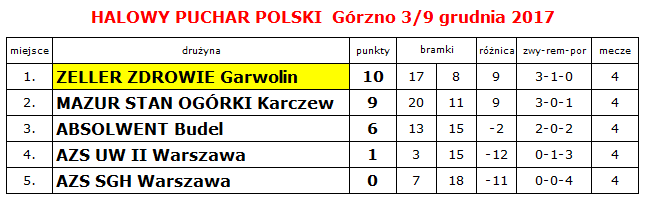 W sobotę 9 grudnia 2017 roku w Hali Sportowej w Górznie odbyła się druga tura turnieju, który wyłonił reprezentanta Mazowsza w 1/32 Halowego Pucharu Polski. Zwycięzcą został ZELLER ZDROWIE Garwolin, który w decydującym meczu pokonał MAZUR STAN OGÓRKI Karczew 6:2. Niestety z udziału wycofały się ekipy AZS UW II Warszawa i AZS SGH Warszawa. Powodem tej decyzji był prawdopodobnie brak szans na awans do następnej rundy Pucharu Polski.