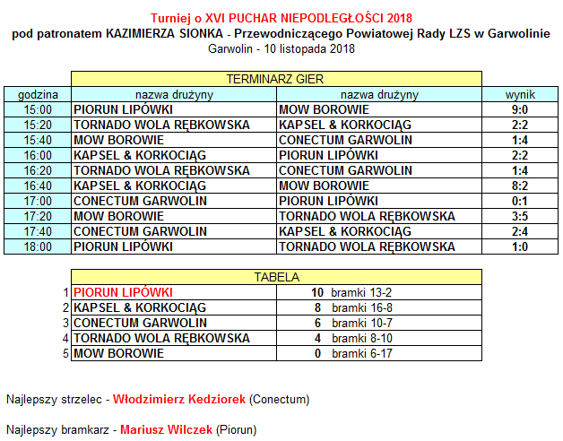W turnieju zwyciężył zespół Pioruna Lipówki, który okazał się najlepszy spośród 5 zespołów uczestniczących w turnieju. Drugie miejsce zdobył Kapsel & Korkociąg, a trzecie Conectum Garwolin. Turniej był rozgrywany systemem każdy z każdym. Najlepszym strzelcem został Włodzimierz Kędziorek z Conectum, zdobywca 6 bramek. Najlepszym bramkarzem został Mariusz Wilczek z Pioruna, który przepuścił tylko 2 bramki w całym turnieju. Zespół Poioruna Lipówki wystąpił w składzie: Mariusz Wilczek (bramkarz), Piotr Dziedzic, Daniel Szostak, Piotr Dąbrowski, Mateusz Foryś, Marcin Saganek, Jakub Saganek, Daniel Kasprzak. Dryżynę prowadził i taktykę obmyślał Piotr Dziedzic.