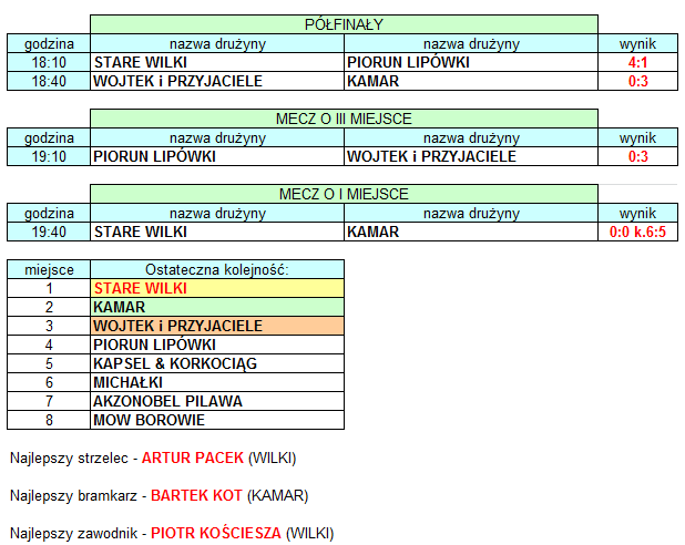 Najlepszym strzelcem został Artur Pacek ze Straych Wilków, strzelec 7 bramek. Najlepszym bramkarzem turnieju został Bartek Kot z Kamaru, który puscił tylko dwie bramki w 5 meczach.Najlepszym zawodnikiem został wybrany Piotr Kościesza (Wilki)