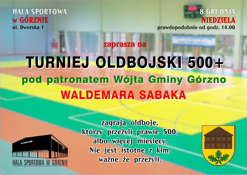 W niedzielę 8 grudnia 2019 roku w Hali Sportowej w Górznie odbędzie się piłkarski Turniej Oldbojski 500+. Zapraszamy odbojów, którzy przeżyli blisko 500, albo więcej miesięcy. Uściślając w turnieju mogą grać zawodnicy urodzeni w 1979 roku i starsi. Na prośbę drużyn możemy skorzystać z programu 300+, czyli z jednego zawodnika urodzonego w 1980 roku.