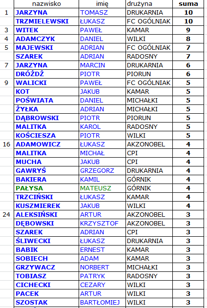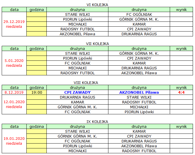 19:00 CPI Zawady – AKZONOBEL Pilawa 4:4 (awansem z VIII kolejki)